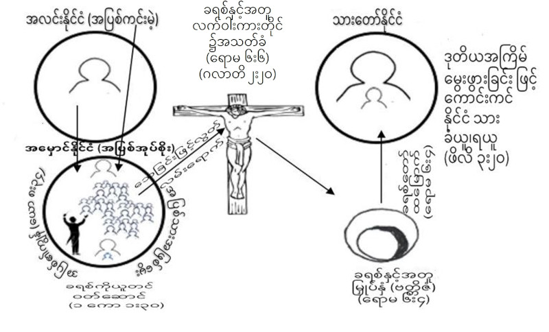 သင်ခန်းစာ (၁၁)၌ လူသည် ပညတ်တရားမလိုက်လျှောက် နိုင်သော ကြောင့် ကျိန်ခြင်းခံရကြောင်းသိခဲ့ရပြီ။ အဘယ်ကြောင့်ဆိုသော် ပညတ်တရား လျှောက်ရာတွင် တခုမကျန် မခြားမလပ် လိုက်လျှောက်ဘို့လိုသည်။ မိတ်ဆွေအပါအ၀င် လူသားတိုင်းသည် ပညတ်တော်မလိုက်လျှောက်နိုင်သောကြောင့်ကျိန်ခြင်းခံရကြသည် (ဂလာတိ ၃:၁၀- ၁၃)။ ကျိန်ခြင်းခံသောသူသည်သစ်တိုင်မှာဆွဲထားခြင်းခံရမည်။ သို့သော်ခရစ်တော်သည်ငါတို့အတွက်ကြောင့်ကျိန်ခြင်းကိုခံသောသူဖြစ်၍ ငါတို့ကိုပညတ်တရား၏ကျိန်ခြင်းမှ ရွေးနှုတ်တော်မူပြီ (ဂလာတိ ၃:၁၃)။ ခရစ်တော်သည် ငါတို့ကိုယ်စားကျိန်ခြင်းခံခဲ့သည်။ ထို့ကြောင့်သစ်တိုင်တည်းဟူသော လက်၀ါးကပ်တိုင်ပေါ်မှာ ဆွဲထားခြင်းခံခဲ့ရသည်။ သို့ဖြစ်၍ မိတ်ဆွေသည် ကျိန်ခြင်းမှ လွတ် မြောက်ပြီ။ သစ်တိုင်ပေါ်မှာ ဆွဲထားခြင်းခံစရာ မလိုတော့ချေ။ ကျိန်ခြင်းနှင့် သေခြင်းမှလွတ်မြောက်ခြင်းသည် မိတ်ဆွေ၏ကြိုးစားမှုနှင့် အကျင့်ကြောင့်မဟုတ်၊ ဘုရားသခင်၏စီစဥ်ပေးမှုဖြင့် ခရစ်တော်ကကိုယ်စားခံပေးသောကြောင့်ဖြစ်သည်။ ဘုရားသခင်၏ ကျေးဇူးတော်သက်သက်ကြောင့်သာလျှင်ဖြစ်သည်။ ထိုအရာကို ယုံကြည်လက်ခံဘို့လိုသည်။